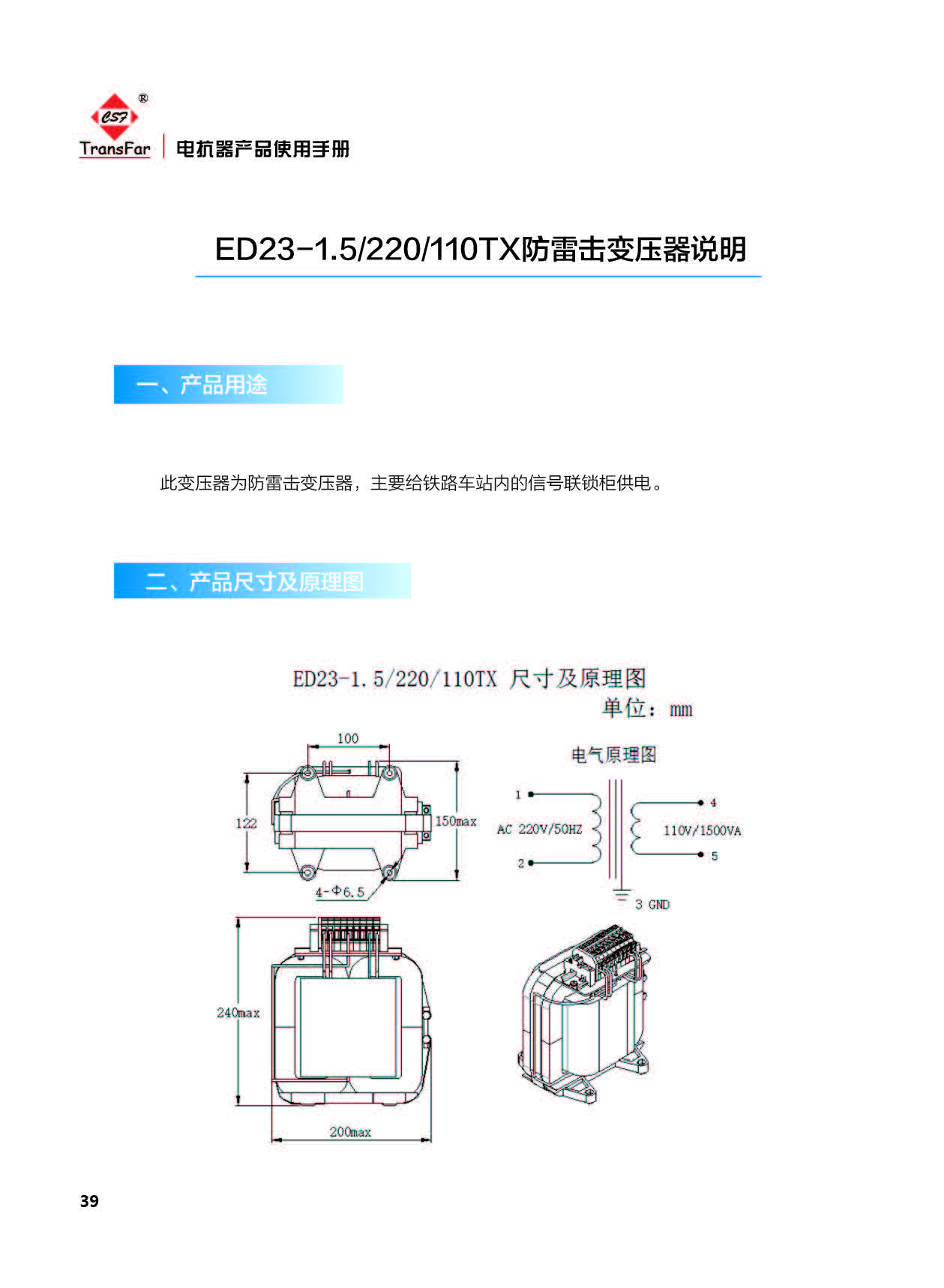 ED23-1.5/220/110TX型防雷变压器